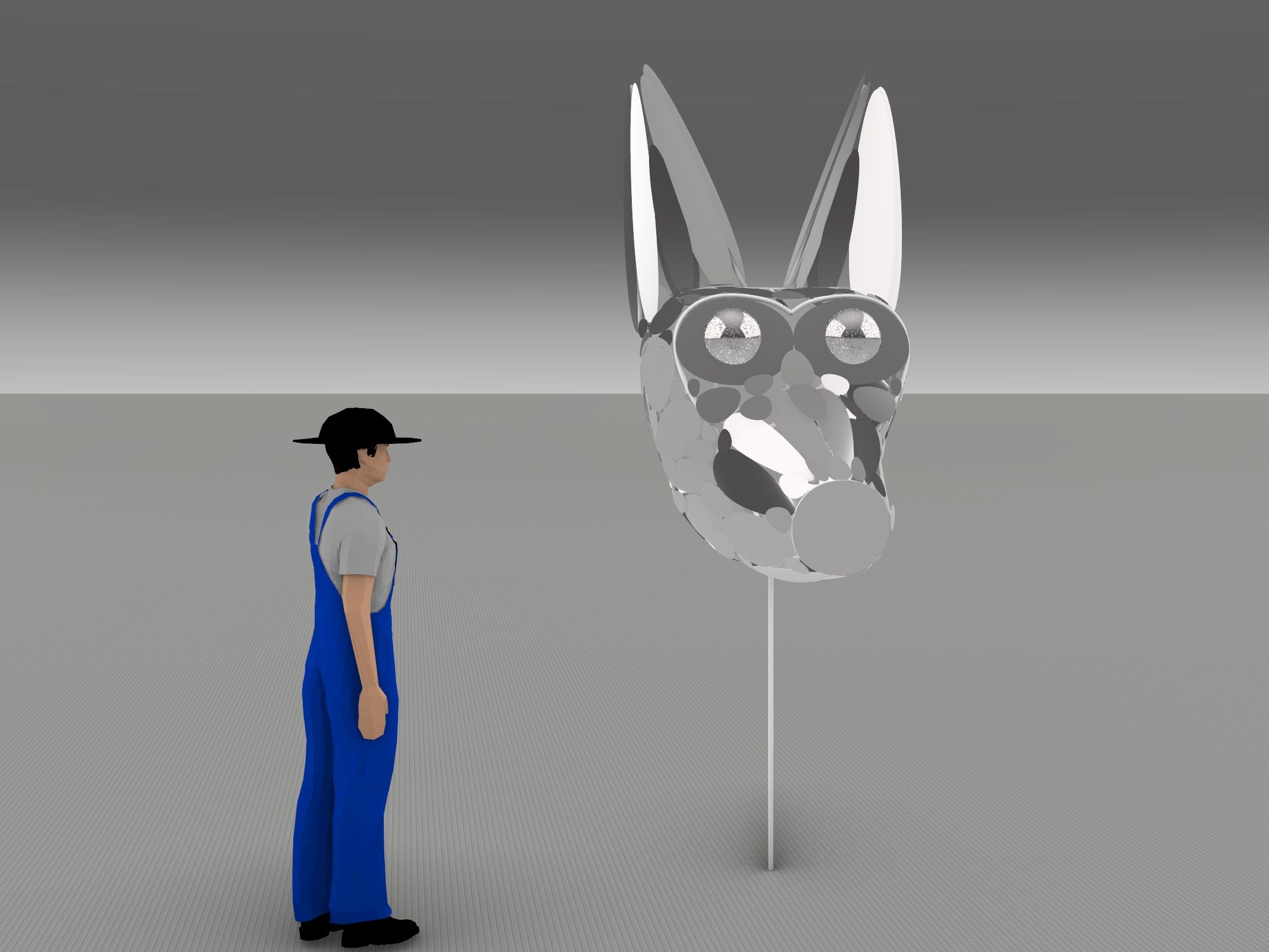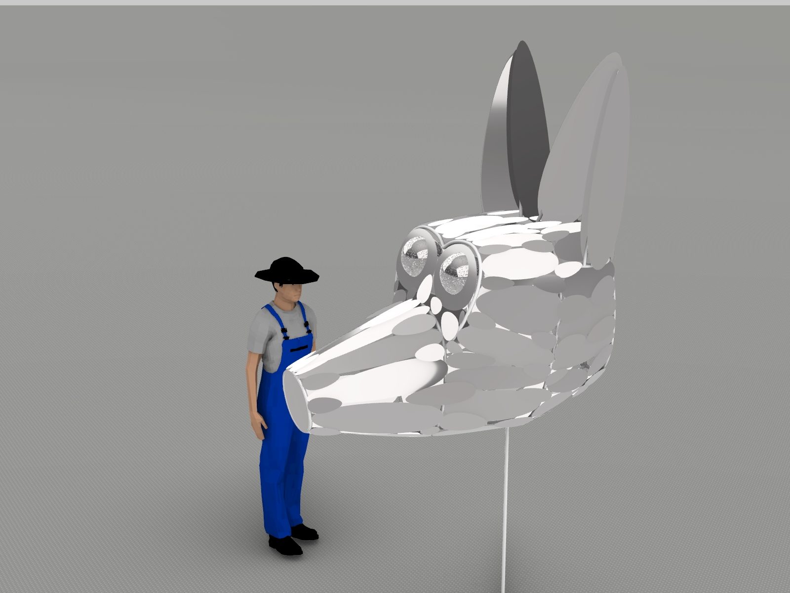 A metal sculpture of a dog’s head, covered in shiny mirrors with disco balls for eyes. The head will rotate freely to capture and reflect sunlight during the day. At night a spotlight will shine its beam on the sculpture and sparkle like a star.